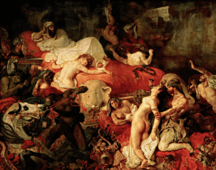 1827년에 완성된 들라크루아의 가장 유명한 작품 중 하나인 "사르다나팔루스의 죽음"은 그의 낭만주의 감성을 보여주는 놀라운 예입니다.