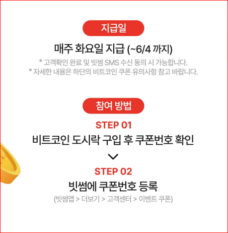 금액 5900원인 비트코인 도시락에 쿠폰이 동봉돼 있습니다. 쿠폰의 QR코드를 통해 빗썸 애플리케이션에 들어가 쿠폰번호를 입력하고 고객확인 완료·SMS 수신동의를 하면 1만 원 상당의 비트코인을 받을 수 있는 겁니다.