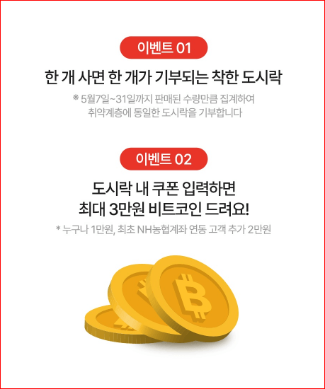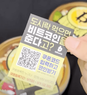 도시락을 구매하면 비트코인을 받을 수 있는 쿠폰을 주는데요 쿠폰의 qr 코드를 통해 가상자산 거래소 앱을 접속하면 만 원 상당의 비트코인을 받을 수 있고, 신규 이용자는 2만 원 상당의 비트코인을 더 받을 수 있다고 합니다