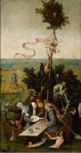 그런데 이렇게 타락한 광인들로 가득 찬 이 배는 지금 어디로 흘러가고 있는 것일까요? 그림 제목에서 'Nef'는 불어로 '배'를 의미합 니다. 교회에서 신자들이 앉는 공간도 'Nef'라고 합니다. 즉, 불안정한 물 위를 안전히 건널 수 있게 만드는 배는 교회를 의미하며, 이 속에 있는 사람은 모두 천국으로 가기를 희망할 것입니다. 하지만 그들은 술에 취해 방탕함에 빠져 있어 이 배의 목적지는 지옥이 될 수도 있습니다. 그들이 다행히 자신의 어리석음과 방탕함을 깨닫는다면 천국으 로 갈 수 있겠죠. 그래서 화가는 마지막으로 관람자에게 이런 질문을 던지고 있는 것 같습니다.
