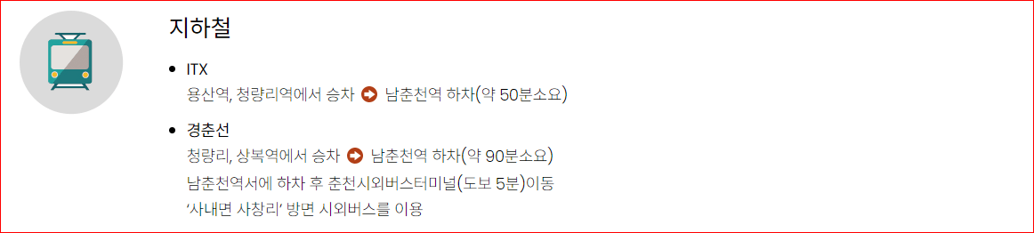 ITX청춘: 용산, 청량리 출발, 남춘천역 하차 후 춘천시외버스 터미널에서 사내면 사창리 방면 버스 이용